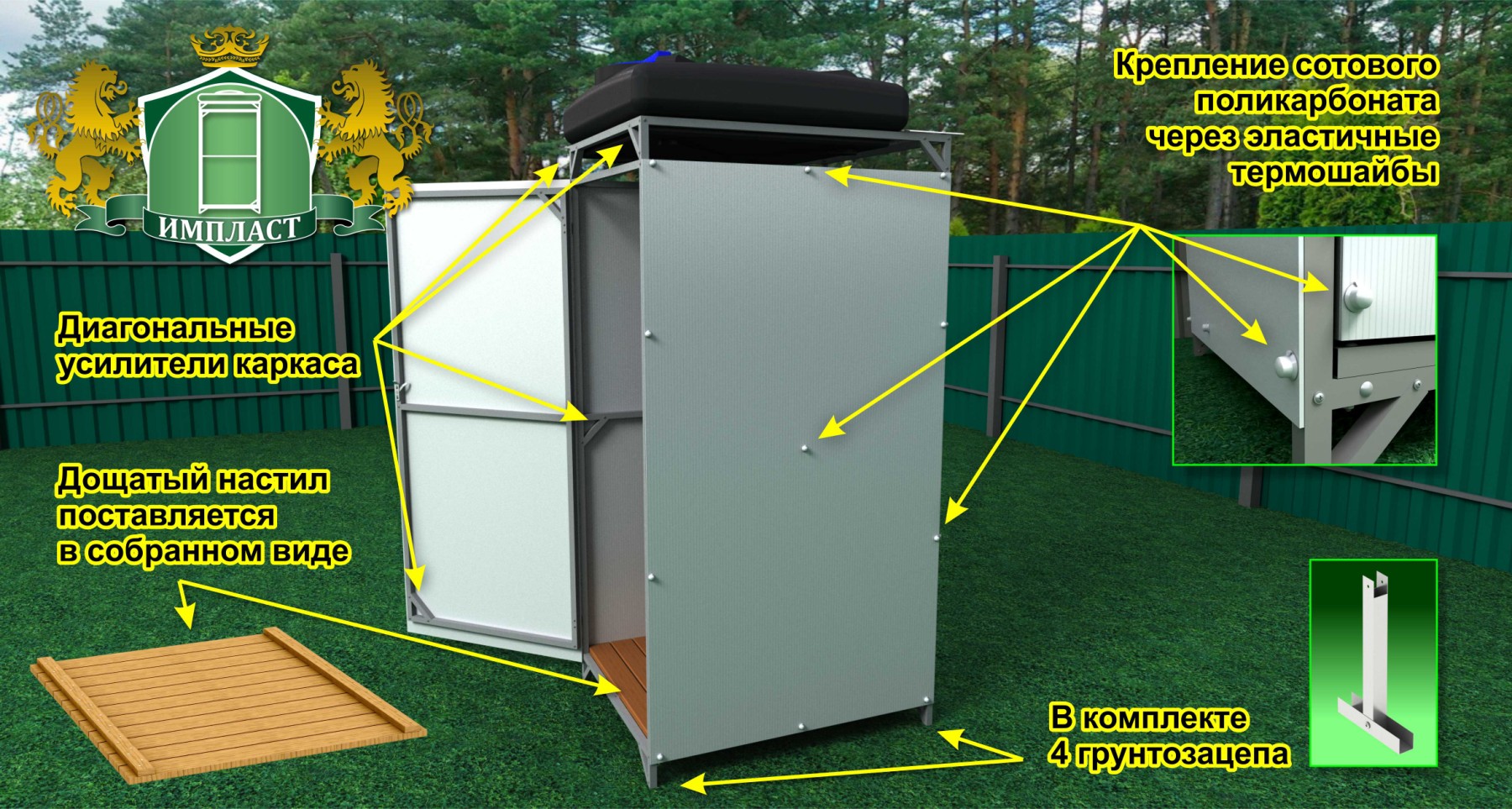 Новейшая разработка Российского производства. Каркас создан специально, что бы не ржавел и его не приходилось разбирать на зиму. Победитель 3х подряд агровыставок. Каркас приходит в полусобранном виде(даже двери навешены), что облегчает сборку.